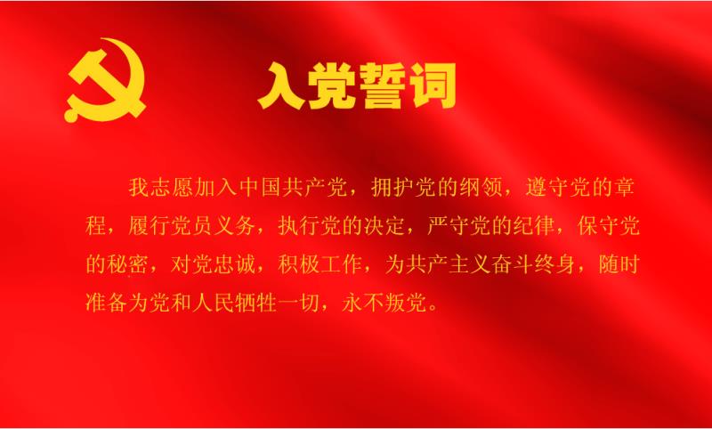 第六条 预备党员必须面向党旗进行入党宣誓。誓词如下:我志愿加入中国共产党,拥护党的纲领,遵守党的章程,履行党员义务,执行党的决定,严守党的纪律,保守党的秘密,对党忠诚,积极工作,为共产主义奋斗终身,随时准备为党和人民牺牲一切,永不叛党。