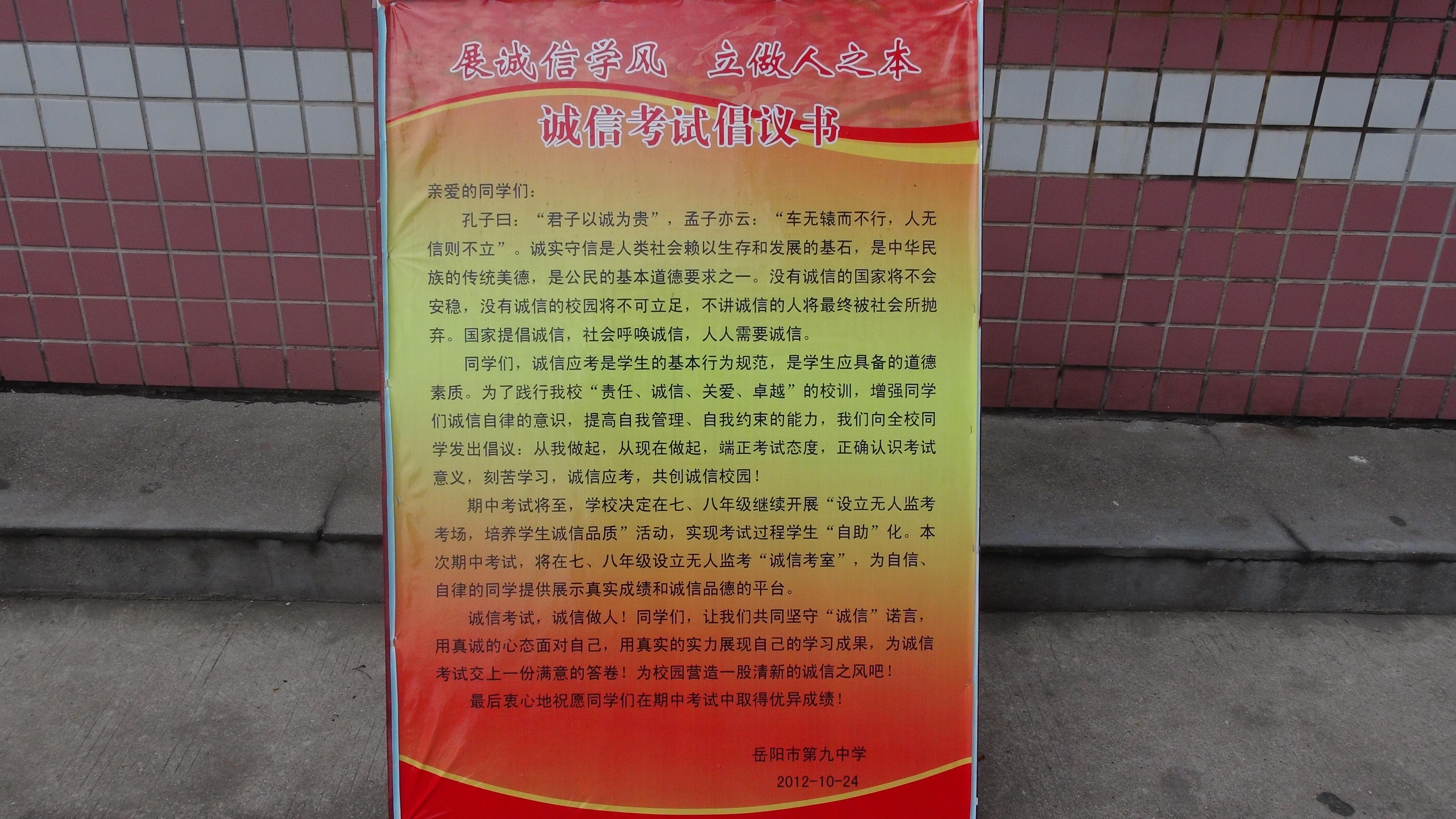 期中考试将至,学校决定从本学期开始,在期中﹑期末考试中开展“设立无人监考考场,培养学生诚信品质”活动,实现考试过程学生“自助”化。本次期中考试,学校将在七年级设立六个无人监考“诚信考室”。以后逐步设立更多的“诚信考室”,为更多自信、自律的同学提供展示真实成绩和诚信品德的平台。