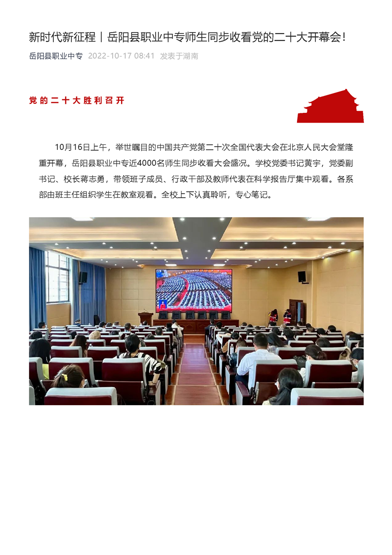 新时代新征程丨岳阳县职业中专师生同步收看党的二十大开幕会!