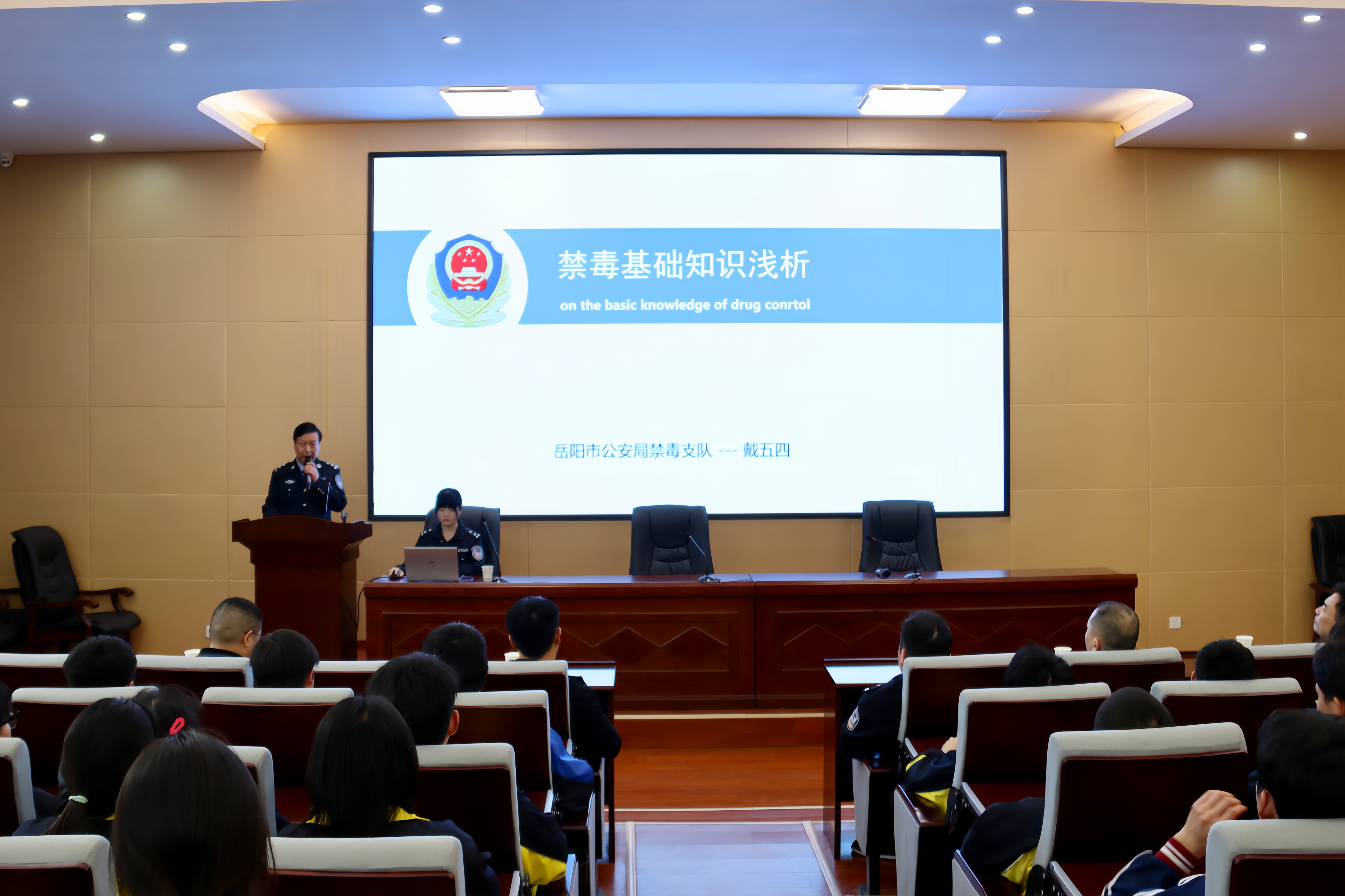 市公安局禁毒支队禁毒专家--戴五四警官从毒品种类、毒品危害、拒绝毒品诱惑、识别吸毒人员、艾滋病的危害与预防等方面,通过真实案例告诫学生提高自身识毒、防毒、拒毒的本领。